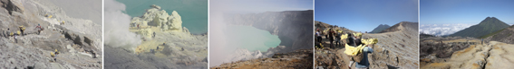 La pause s’achève et l’ascension reprend pour rejoindre le haut du cratère perché à 2380 m. Le cracheur de souffre porte bien son nom ! Nous arrivons dans un nuage sulfureux qui nous fait suffoquer. Les allergiques fuient, les autres humidifient leur foulard et persévèrent. Le volcan est en pleine activité et les hommes au fond du cratère s’activent. Impossible de les rejoindre aujourd’hui sans gêner l’ascension des porteurs chargés des blocs jaune fluo. Au travers des vapeurs nous tentons d’apercevoir le souffre liquide qui coulent et se solidifie. Un souffle bénéfique dégage le nuage sulfureux et nous regardons émerveillés le lac cyan apparaître, les coulées de souffre orange, les blocs jaune que les hommes cassent pour rapporter la précieuse matière et la revendre pour quelques roupies. Le paysage révélé est magnifique, desséché et lunaire sur les arêtes du cratère, coloré et animé en son sein. Notre effort est largement récompensé, même s’il est bien dérisoire comparé à celui de ces hommes qui pour faire vivre leur famille arpentent 2 à 3 fois par jour, jour après jour, inlassablement, les pentes du volcan.
